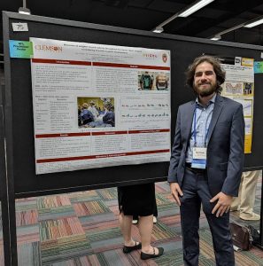 PhD student Matthew Ball presented a lecture titled “Investigating Adaptive-Training Curricula for Robotic Skills Training” (left) and a poster titled “Measures of Surgeon Muscle Activity Throughout Live Hernia Repair Surgery Considering Shoulder-Support Exoskeletons” (right).